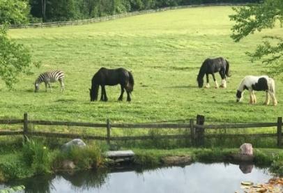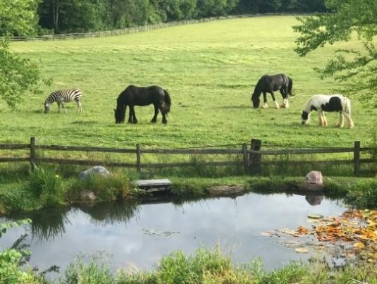 The land is about 80 acres and is surrounded by 500 acres of Geauga Park land and the Geauga Rookery. The Chagrin River wanders along and through the forest of the east boundary offering beautiful places to dwell by the water and to splash about on warm days. The west boundary is guarded by a Hemlock forest and old Canadian Glacial Rock and ledge formations and millions of 1.1 billion year old quartz pebbles...hence the name Pebble Ledge. On the north boundary is a three acre natural bog with amazing lily pads, water birds, turtles and many other primordial critters of the bog. The south boundary is living space for people and horses. The 20 acre rolling pasture is home to the herd of 7 remarkable horses and one courageous zebra, which live freely, joyfully and at peace.
